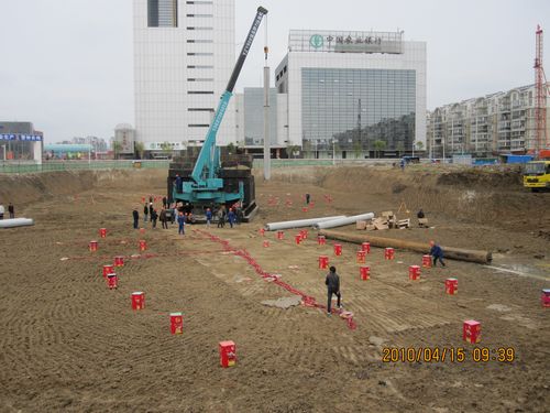 金融中心工程是十七冶在蚌三大BT项目之一,自328日破土动工以来,已施工完高压旋喷桩170根,钻孔灌注桩40根,AB两栋25层写字楼基坑已挖至-5.2m,土方外运量达40000方。