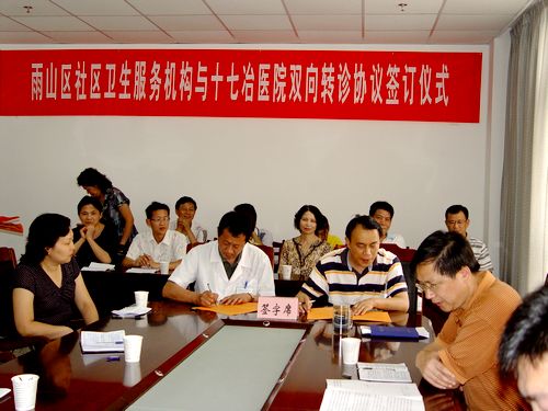为贯彻落实《马鞍山市人民政府关于加快发展城市社区卫生服务的意见》的精神,促进大中型医院与社区卫生服务机构之间形成业务联动、优势互补、疾病诊治连续化管理的机制,十七冶医院和雨山区卫生局经过研究,区卫生局确定十七冶医院作为全区上转定点医疗机构,区卫生局负责全区医疗卫生服务机构首诊制和双向转诊的统筹规划、定点管理、协调组织和监督管理工作;十七冶医院负责对全区医疗卫生服务机构进行业务指导等一系列工作。十七冶医院副院长陈卫东与雨山区十家卫生服务机构负责人签定了双向转诊协议书。院长王仲恺在会上强调:十七冶医院有责任、有义务为雨山区居民服务,提高医疗资源的利用率,更好地为社区患者服务。会上,十七冶医院相关科室作了科室各种业务项目的介绍,使参加会议的社区卫生服务机构负责人对十七冶医院医疗业务有了进一步的了解和认识。