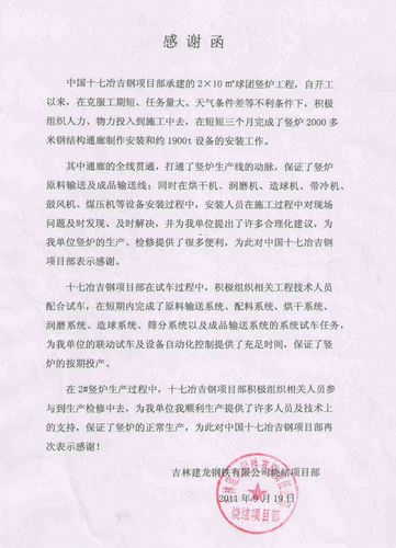 近日,十七冶吉钢项目部再次收到吉林建龙钢铁有限公司发来的感谢函,称赞十七冶承接的吉钢2号竖炉安装质量优良。