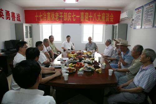 629,中国十七冶集团召开离休老干部庆七一喜迎十八大座谈会,公司党委书记、董事长王建国,副总经理、纪委书记、工会主席方荣华及董事会秘书汤小建、组织文化部、人力资源部负责人与12位离休老干部代表共同参加了座谈会。