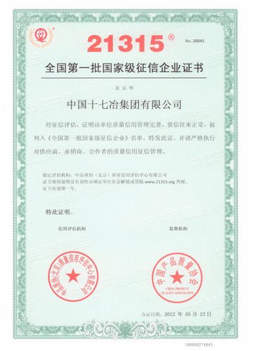 近日,中国十七冶集团顺利通过中国产品质量协会关于国家级企业信用等级的复审,继续保持了“全国第一批国家级征信企业”荣誉称号,并同时荣获“