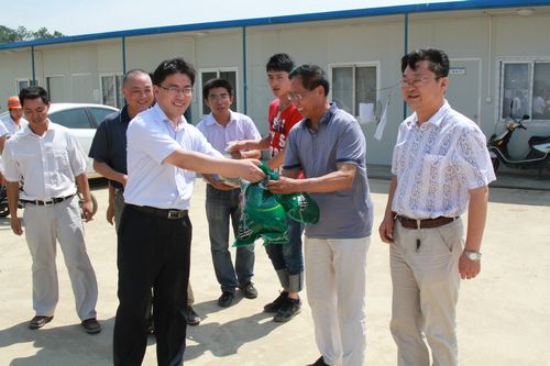 75日,中国十七冶集团副总经理、工会主席方荣华在工会副主席、组织文化部部长杨绍凤的陪同下,深入马鞍山11个保障房项目,为各项目送去绿豆、白糖和茶叶等防暑降温物品。