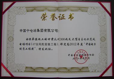 日前,由中国十七冶集团风力与太阳能发电工程技术公司承建的甘肃瓜州300 MW大型自主化示范风电工程和安徽龙源来安4×49.5MW风电工程获得2012年度中国电力优质工程奖。