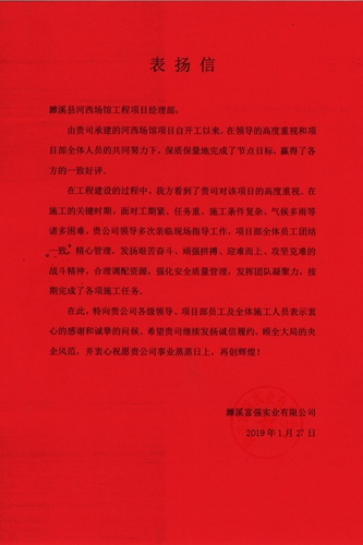 1月27日,濉溪富强实业有限公司向中国十七冶集团有限公司发来表扬信,表扬市政工程技术分公司濉溪县河西场馆项目部在工程建设中做出的突出贡献