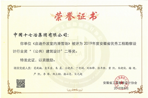 9月9日,中国十七冶集团有限公司工程设计分公司收到获奖证书,由工程设计分公司设计的启迪乔波室内滑雪场荣获2019年度安徽省优秀工程勘察设计行业二等奖。