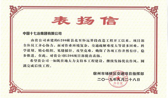 10月9日,中国十七冶收到宿州市埇桥区交通局项目指挥部发来的表扬信,对路桥工程技术分公司宿州G206蕲县北至怀远界段改造工程项目部攻坚克难,顺利完成任务进行了表扬。