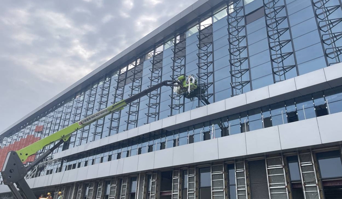该项目体育馆作为大空间结构,对节能环保有着更高的要求。为此,中国十七冶采用了大跨玻璃+穿孔铝单板遮阳双层幕墙设计理念,不仅有效解决自然采光问题,还显著增强了隔热功能。其中看还得中用,就必须在玻璃的选型和加工、幕墙的抗风压能力、穿孔铝单板精准安装上下足功夫。项目团队采取加强幕墙结构的承载能力和创新使用连接方式来提高幕墙的抗风压能力,完成了对幕墙结构和连接方式的大优化。采用先进的数控设备和技术,对穿孔铝单板进行精密加工和制造,利用AR技术将BIM模型1:1还原现场模拟安装,真正做到知道现场安装需求和数据信息,提升安装效率和质量,掌握精准度。通过反复模拟,施工过程能够严格按照预先设定的安装位置精准安装,一次安装到位,节省工时的同时也确保遮阳铝板与玻璃幕墙的紧密衔接和稳定性。