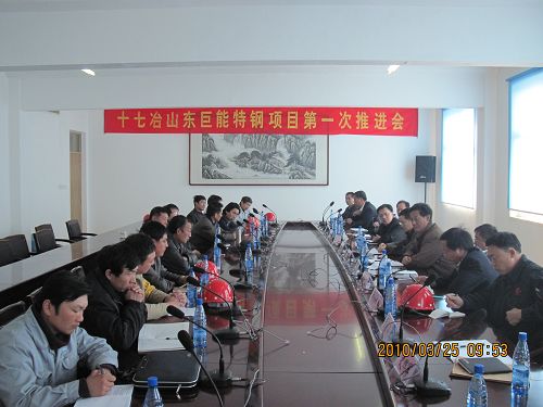 325上午,十七冶山东巨能特钢项目经理部召开了“中国十七冶山东巨能特钢工程第一次推进会”,山东巨能特钢基建部部长李海涛,公司总经理助理王青山、项目监管部部长范文刚、山东分公司经理张赛、装备与制造公司经理胡生春、机电公司经理助理刘焱等出席,项目部全体管理人员、施工单位及技术负责人参加了会议。