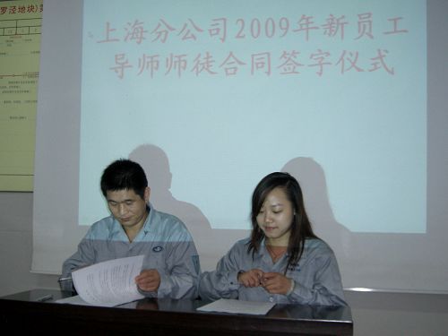 仪式上,各位导师及所带的新员工分别在师徒合同书上签字。导师代表李浩讲了话,他对新员工们提出了希望,勉励新员工在新的岗位上,不断积累实践经验,提高专业理论水平,尊重导师,虚心接受指导。新员工代表王芳发言,表达了新员工共同的心声和决心。上海分公司经理钟华彪简要介绍了上海分公司人员结构和年龄结构,启发并鼓励年轻的新员工在上海宝钢工程建设这个平台上,珍惜机遇、把握好机会,加强个人的品德修养,多向导师们学习,勇于实践、勇于开拓、勤奋学习;同时也要求师傅们不但要传授专业知识,更重要是把十七冶的精神和美好、优良的品德传授给徒弟。他还表示在今后多创造些给大家学习的机会,由专业人员、专家来授课,除本专业精通外,掌握多项技能,努力把他们培养成为一个全面的人才。