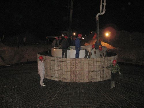 520是业主要求风机基础浇注的第一个网络节点,可由于混凝土供货商服务单位多,搅拌车数量不足,白天无法作业,为了兑现对业主的承诺,项目部挑灯夜战,23号风机机位上灯火通明,机声隆隆,工地上一片繁忙景象。经过一夜的奋战,一个400m3的风机基础呈现在人们面前。业主项目负责人张守峰对此予以高度评价。
