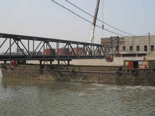 上午8时,作业人员按照项目部制定的步骤操作,顺利完成了通廊上船、浮船托运、靠岸。1020分,河岸两侧的两台130吨吊车将跨河通廊稳稳摆放在通廊支架上,通廊吊装成功。此次大跨度通廊吊装的成功,实现了项目部对业主的承诺,赢得了业主的高度赞誉。