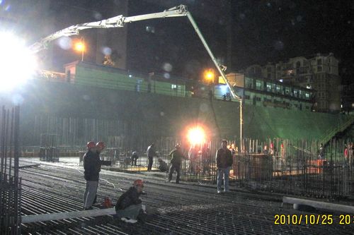 102519:58分,蚌埠金融中心工程项目A楼基础底板开始浇注混凝土,标志着开展劳动竞赛和春节前确保两层地下室结构出±0.00的总体部署实现了一项重大节点。