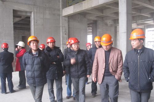 在金融中心项目总工杨建斌、副经理程永华的陪同下,贾成龙经理一行观看了金融中心工程墙体砌筑、电梯井安全防护、脚手架的搭设、消防措施以及现场的管控等。