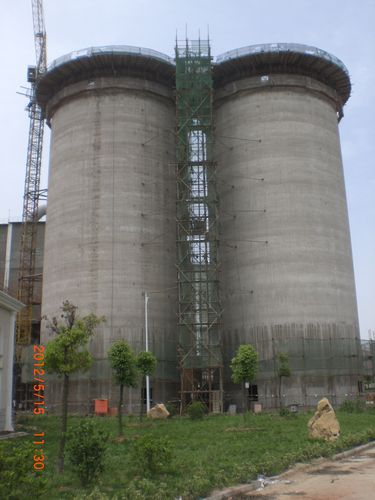 该两座粉煤灰库体型相同,高35.0m,外直径15.6m,库壁厚300mm。两座粉煤灰库于58同时开始滑模,项目部在滑膜过程中,严格控制安全及质量,实行24小时全程跟踪。经过77夜的连续滑膜施工,两座粉煤灰库均顺利滑模到顶。经检查验收,库壁钢筋合格率均达100%,库身垂直度偏差在8mm以内,符合优质工程标准,得到业主和监理单位的高度评价。