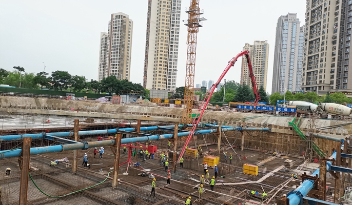 为保证本次浇筑能够顺利完成,项目部多措并举攻克一道道难关。为了克服核心筒地下水位高的问题,项目部会多次研讨,形成了增加降水井降水和加大水泵功率24小时抽水的解决方案。针对钢筋绑扎难度大,钢筋支撑施工复杂等问题,项目部成立技术攻关小组,反复验算采用槽钢支撑的安全稳定性。为了确保混凝土浇筑质量、一次性浇筑成优,项目部组织技术交底,对浇筑的重难点进行深入分析,通过采取冷却水循环及大体积混凝土测温系统,随时掌控混凝土内外温度变化情况,并实地考察混凝土搅拌站原材料的备料情况及车辆准备情况。施工过程中,项目部积极落实“项目管理提升年”和“安全生产提升年”工作要求,全过程全方位监督指导,确保了大体积混凝土安全高效完成浇筑。