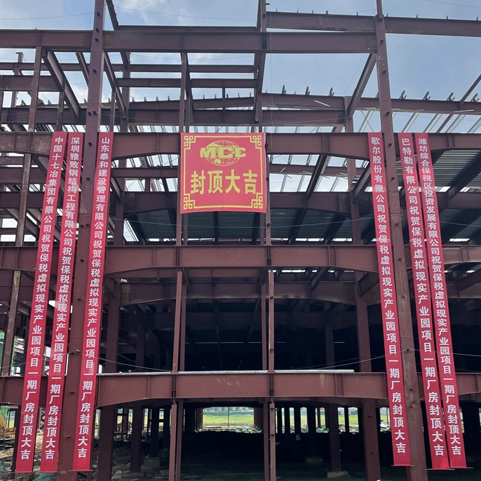 7月30日上午,中国十七冶集团山东分公司承建的山东潍坊保税虚拟现实产业园1#、2#车间及配套工程总承包项目主体钢结构顺利封顶。