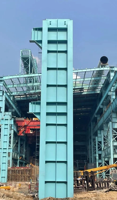 广西盛隆炼钢工程二步高跨布置于车间E-F列1/16-20线,中间设置2座转炉,总高度约74米,炼钢二步高跨钢结构总量约7500吨。首次吊装的高跨E列19线下部框架柱长20.1米,重52.7吨。