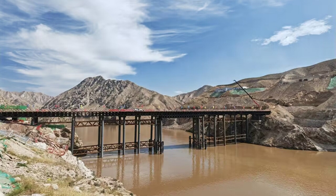 为保证项目主体工程什川黄河特大桥和大河坪隧道的施工便利,三分部项目团队研究决定搭设一座横跨黄河的临时钢栈桥,建设位置于什川黄河特大桥双幅之间,是什川黄河特大桥与小桩号侧大河坪隧道出口端实现施工陆路运输的“生命通道”,也是主桥在黄河两岸同时开展作业的先决条件。它的建成投用,对项目大河坪隧道出口端与整个工程的重要控制节点什川黄河特大桥的建设至关重要。