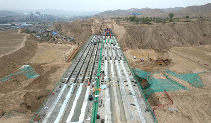 项目位于甘肃省兰州市,全长11.44千米,路线向北沿途设隧道群穿越园林山、凤凰山、大河坪等山岭,终点位于皋兰县和平村。槽沟大桥为双向六车道,路基宽度为33.5米,采用9x30米预应力混凝土连续箱梁,设计预制箱梁共90片,全桥共2联:4x30+5x30米,上部结构采用预应力砼(后张)连续小箱梁,下部结构O号桥台采用助板台,9号桥台采用柱式台,桥墩采用柱式墩,墩台采用桩基础。