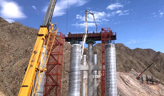 项目位于甘肃省皋兰县及榆中县交界处,由南向北建设大河坪隧道、什川黄河特大桥、上河坪隧道、上河坪大桥等。上河坪大桥为连接上河坪隧道出口及下河坪隧道进口而设,桥梁左幅长度665米,右幅长度750米。桥跨布置为左幅6×50米(波形钢腹板-混凝土组合梁)+12×30米(装配式预应力混凝土连续箱梁);右幅6×50米(波形钢腹板-混凝土组合梁)+15×30米(装配式预应力混凝土连续箱梁)。本桥下部结构桥墩采用柱式墩、桩柱一体墩、箱型墩和空心薄壁墩,桥台采用柱式台,基础均为端承桩,全桥桩基共计206根。