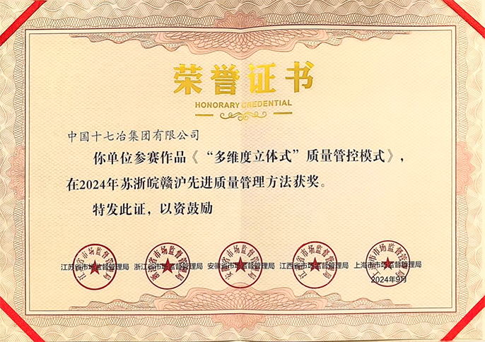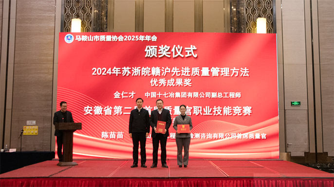 近日,江苏、浙江、安徽、江西、上海“四省一市”市场监管局联合发布2024年苏浙皖赣沪先进质量管理办法”奖,中国十七冶申报的质量管理方法《“多维度立体式”质量管控模式》2024年入选“苏浙皖赣沪先进质量管理方法”优秀案例后,首次荣获该奖项。1月15日,在马鞍山市质量协会2025年年会上,马鞍山市副市长左年文为公司颁发了荣誉证书,公司副总工程师、技术质量管理部部长金仁才参加会议。