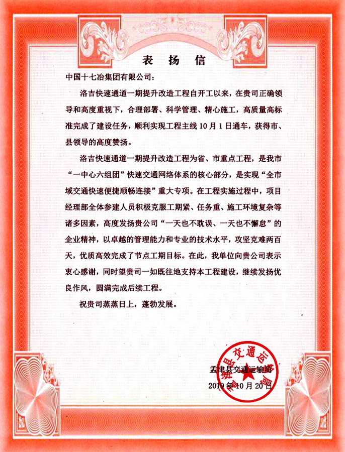 10月20日,从河南省孟津县交通运输局传来表扬信,对中国十七冶交通工程技术分公司高质量高标准完成孟津县交通基础设施一期工程建设任务,顺利实现工程主线10月1日通车予以高度赞扬。