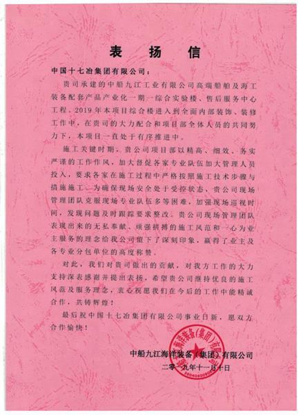 中船九江海洋装备(集团)有限公司向十七冶致表扬信