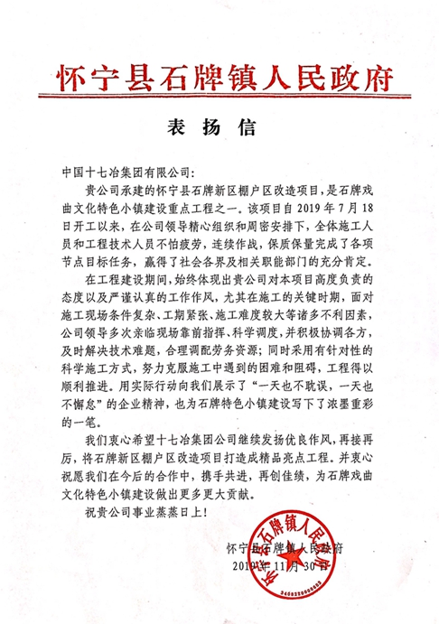 122日,中国十七冶集团收到安徽怀宁县石牌镇人民政府发来的表扬信,对房屋工程技术分公司项目管理团队在怀宁县石牌镇棚户区改造项目建设中,保质保量完成各项节点目标给予高度赞誉。
