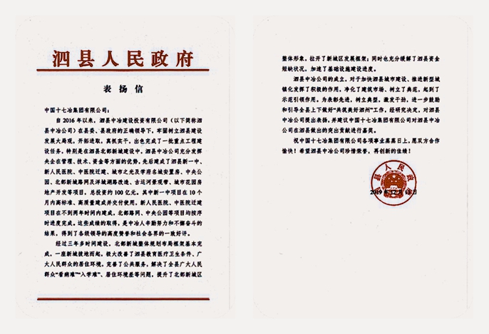 1219日,安徽泗县人民政府发来表扬信,对泗县中冶建设投资有限公司在泗县发展建设上作出的突出贡献给予高度赞扬。