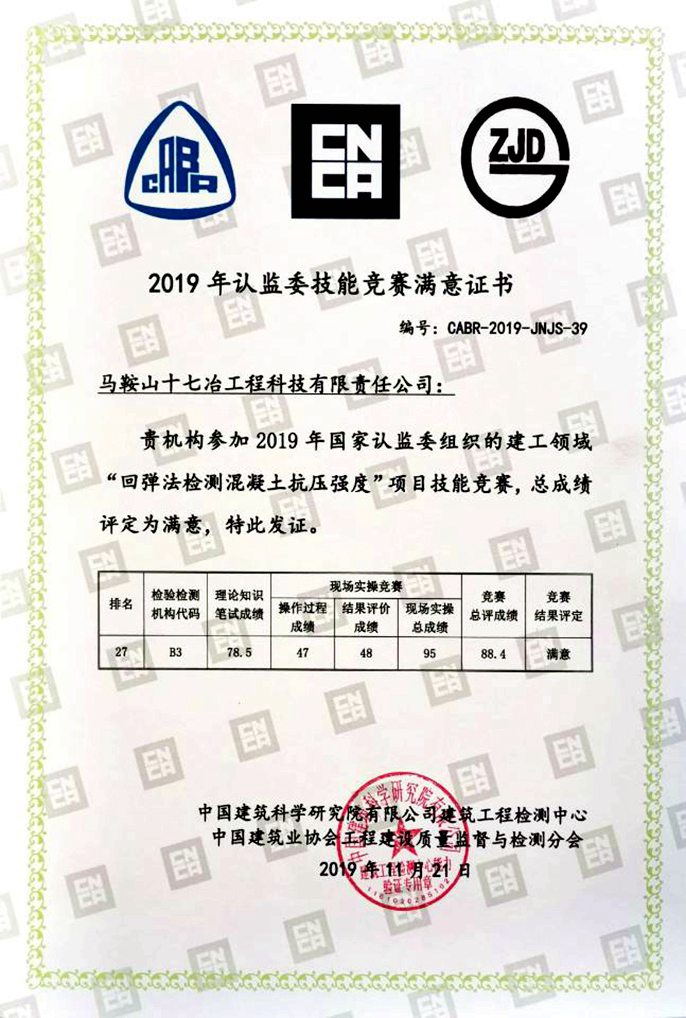 12月26日,从国家建筑工程质量监督检验中心官网获悉,十七冶科技公司获2019年认监委建工领域“回弹法检测混凝土抗压强度”项目技能竞赛满意单位。