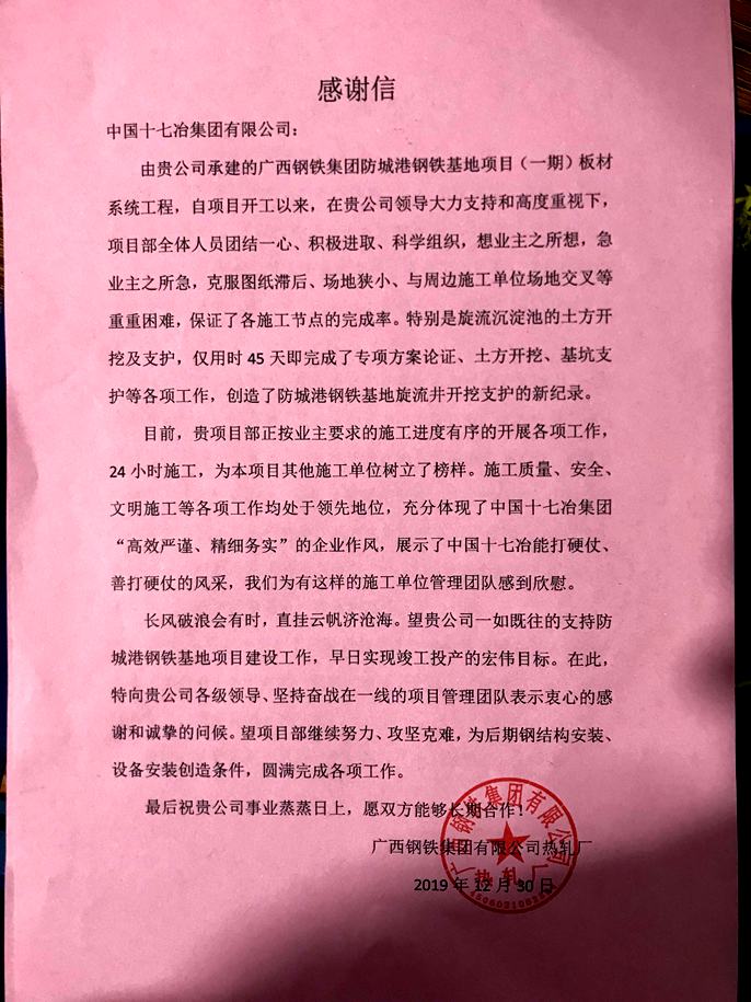 1230日,中国十七冶集团收到广西钢铁集团热轧厂发来的感谢信,对冶金工程技术分公司项目部管理团队保质保量完成各项节点目标给予高度赞誉。