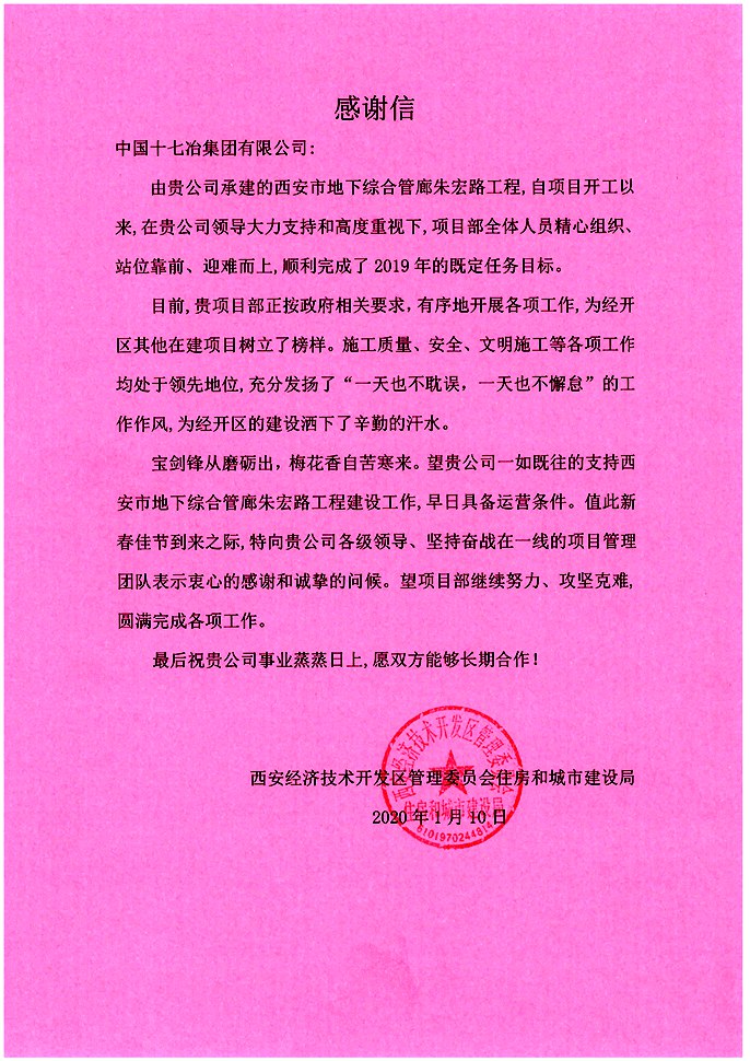110日,西安市经济技术开发区住房与城市建设局向中国十七冶集团发来感谢信,对西安管廊朱宏路工程项目部顺利完成2019年既定建设任务和积极配合管委会推进工程建设表示感谢。