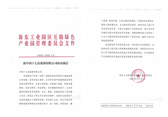 表扬信中指出,项目自开工建设以来,十七冶项目部统一思想、科学组织、周密安排,主动克服各种困难,严格落实标准要求,狠抓工程质量安全,全力推动项目建设,顺利完成施工节点各项目标任务。十七冶在项目建设过程中表现出无私奉献、顽强拼搏的施工风范和一心为业主服务的理念给我留下了深刻印象,赢得了地方各界的高度赞誉。同时也希望十七冶在今后的工作中继续保持优良的施工风范及服务理念,为互助绿色产业园建设及互助地方经济发展做出新的贡献。