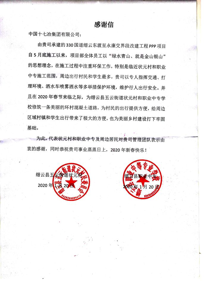 120日,缙云县五云街道状元村民委员会、职业中等专业学校向中国十七冶集团有限公司发来感谢信,感谢路桥工程技术分公司330国道缙云东渡至永康交界段改建工程PPP项目部为状元村和职业中等专业学校修筑了一条美丽的环村混凝土道路,为村民和学生的出行提供了极大的便利。