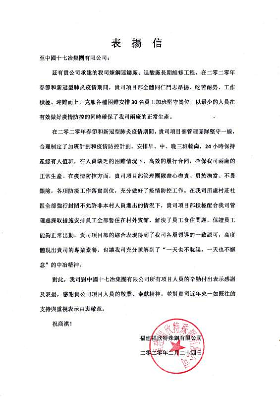 福建福欣特殊钢有限公司向十七冶致表扬信
