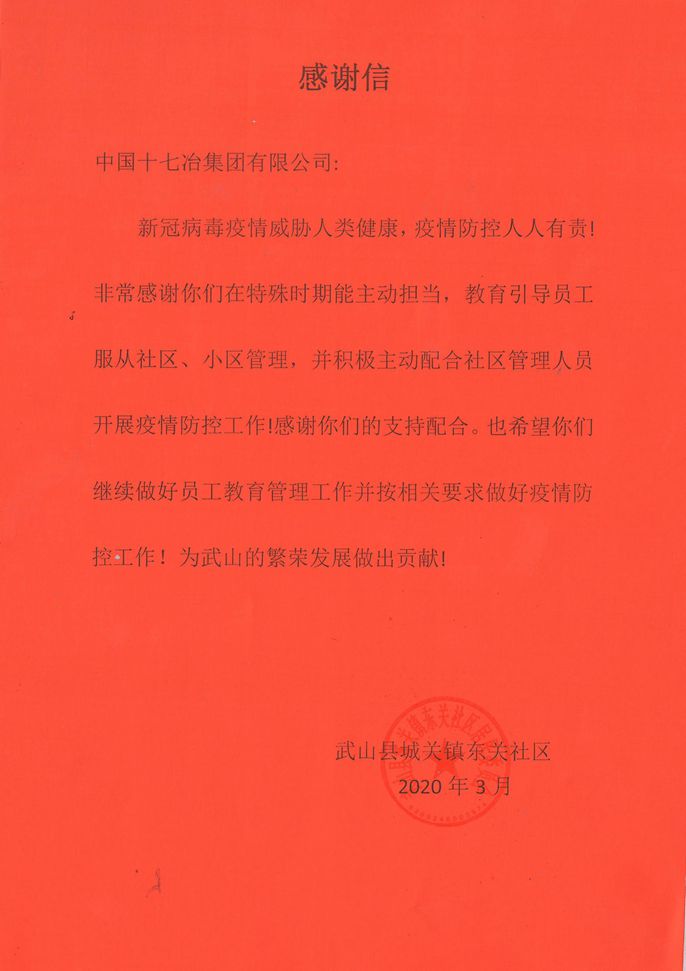 感谢信指出,新冠肺炎疫情威胁人类健康,疫情防控人人有责。非常感谢十七冶项目在特殊时期能主动担当,教育引导员工服从社区、小区管理,并积极主动配合社区管理人员开展疫情防控工作。同时希望项目部继续做好员工教育管理工作并按相关要求做好疫情防控工作,为武山县的繁荣发展做出贡献。