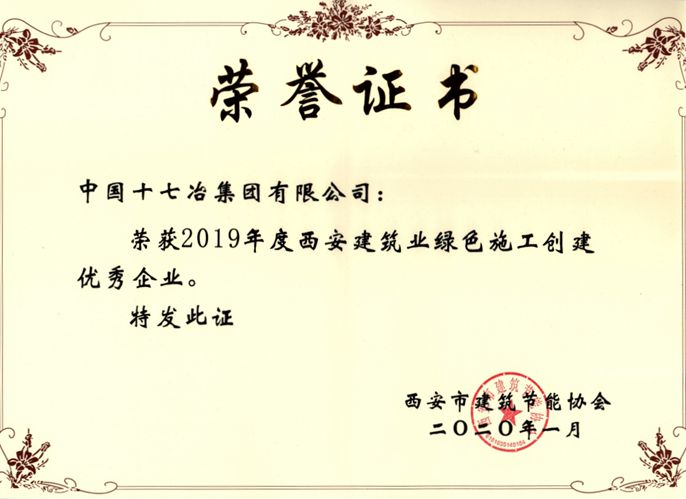 43日下午,中国十七冶集团收到西安市建筑节能协会颁发的2019年度西安建筑业绿色施工创建优秀企业奖证书。