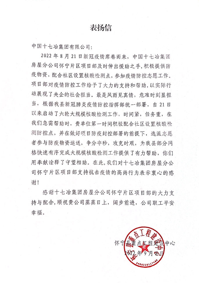 9月8日,怀宁县重点工程建设中心向中国十七冶集团致表扬信,对怀宁片区项目部心系疫情防控,及时伸出援手,投入人力、物力、财力,以善行担起守望相助的社会责任,以义举筑起人道主义的家国情怀,维护疫情防控大局表示感谢。