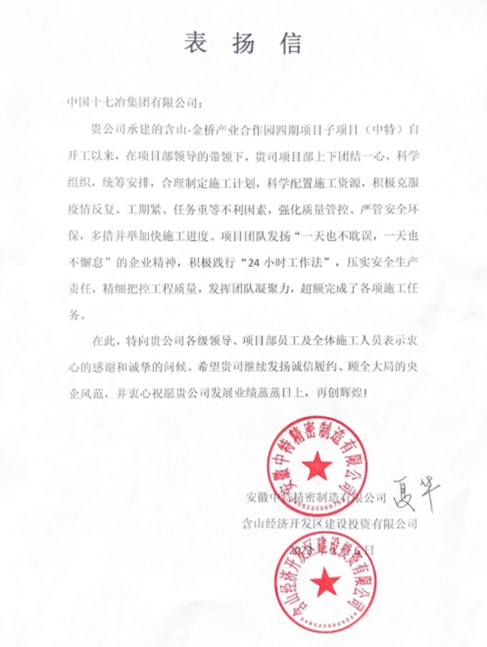 安徽中特精密制造有限公司、含山经济开发区建设投资有限公司向十七冶致表扬信