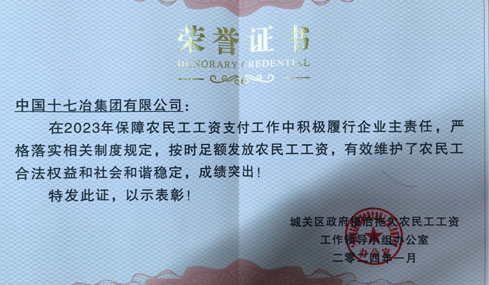 1月17日,兰州市城关区政府根治拖欠农民工工资工作领导小组办公室授予中国十七冶集团荣誉证书,对甘肃分公司省政府为民实事共有产权住房项目部按时足额发放农民工工资,维护农民工合法权益和社会和谐稳定提出表扬。