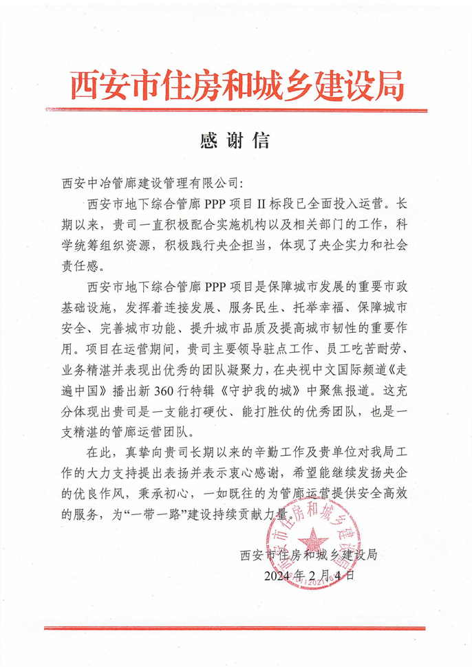 2月4日,西安市住建局向西安中冶管廊建设管理有限公司致感谢信,对项目公司长期以来的辛勤工作及支持表示衷心感谢。