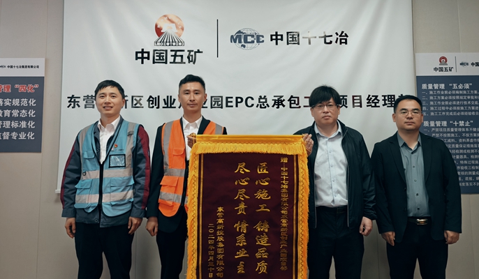 4月30日,东营高新控股集团有限公司副总经理苗洪涛一行向中国十七冶东营高新区创业产业园项目部赠送“匠心施工,铸造品质,尽心尽责,情系业主”锦旗,对项目团队高质量推进建设任务表示感谢。