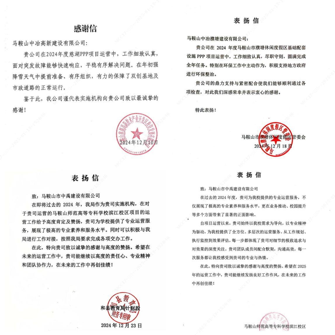 马鞍山慈湖高新区投资发展有限公司在致中冶高新的感谢信中指出,中冶高新在慈湖PPP项目运营中,工作细致认真,面对突发故障能够快速响应、平稳有序解决问题。特别是在年初强降雪天气中提前准备、有序组织,有力保障了双创基地及市政道路的正常运行;市濮塘休闲度假区管委会在致中冶濮塘的表扬信中指出,中冶濮塘在马鞍山市濮塘休闲度假区基础配套设施 PPP项目运营中,工作细致认真、尽职守则,圆满完成全年任务;市师范高等专科学校滨江校区及和县教育局在致中禹建设的表扬信中指出,项目运营以来,项目团队始终以学校需求为导向,以专业精神为驱动,为校园提供了全方位、多层次的运营服务,从工作规划、执行监控到效果评估,都体现了项目团队对细节的极致追求与对效果的深度关注。