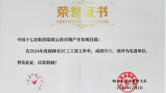 近日,中国十七冶响水瑞璟云府房地产开发项目部获评响水县保障农民工工资支付工作“先进单位”。