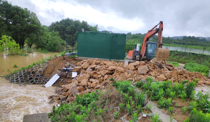 6月15日上午,持续大暴雨让濮塘凤山兴霸村污水站防汛形势告急,项目部紧急调动大型机械及车辆,驰援污水站,经过8小时的紧张抢险,顺利完成防护任务。6月21日,濮塘森林公园景区剑湖路中段被泥石流冲垮,情况相当危急,项目部与镇、村领导一起勘查现场并敲定围堰方案,经过一天一夜加班抢险,剑湖路中段终于在凌晨恢复通车。