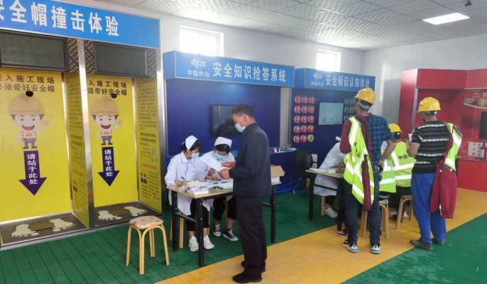 在项目施工现场,12名医护人员带着医疗检查设备安全体验区的体检室为在岗全体作业人员进行健康体检。体检项目包括测量血压、血常规、心电图等。体检过程中,项目部的管理人员维持体检秩序,使体检活动井然有序进行。