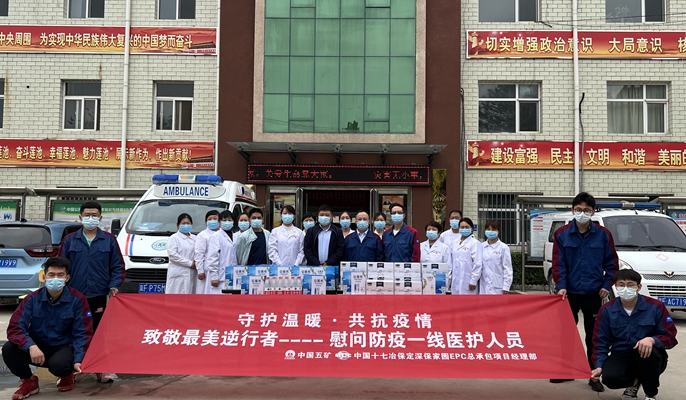 慰问现场,项目书记代表项目部向奋战在防疫一线的工作人员表达了慰问与感谢,并表示参与防疫工作,履行社会责任,是中国十七冶人一贯秉持的奉献精神,将一如既往地积极参与配合防疫工作,全力以赴打赢疫情防控阻击战。
