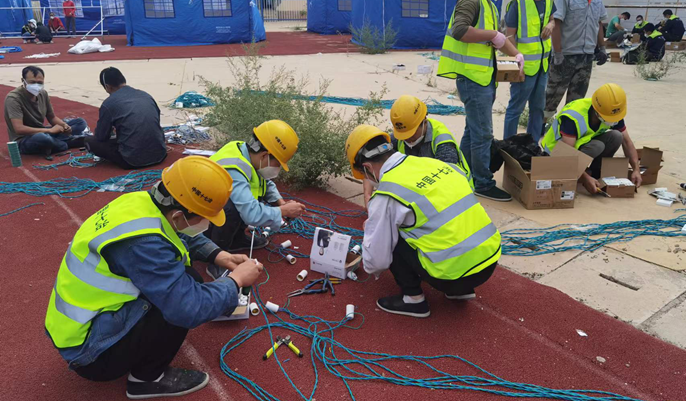 新疆南方中央商务区项目援建任务主要分为2500个隔离帐篷的水电安装及帐篷内防潮垫、室内装饰等的布置摆放工作及现场全部垃圾清理清运工作。在项目人员进场后,摆在面前的是安装工程时间短、工程量较大,施工高峰集中,施工协调难度大等各方面困难。