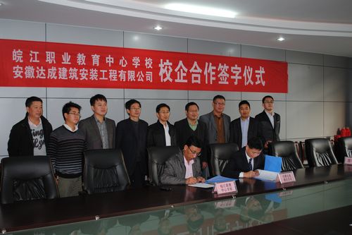 皖江职业教育中心学校副校长赵祖林在仪式上发表了热情洋溢的致辞,并与达成公司副总经理刘金海分别代表校企双方签字。双方就互认挂牌、顶岗实习、订单培养、合作办学等方面达成协议,并在铆焊工、钳工、电工等相关专业中,为企业定向培养、输送实用型技能人才。